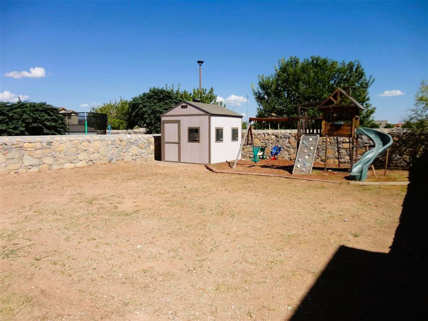 Impeccable two story Eastside home with refrigerated air located in quiet neighborhood. Home features living area, breakfast area, loft, three bedrooms, two full bathrooms & single car garage. Among the many amenities included are ceiling fans, kitchen island, pantry, full stainless steel kitchen appliance package, kids gym set, storage shed, garage door opener, garage door opener remote, front covered patio, back covered patio & much more. Front yard is professionally landscaped. Home is located close to parks, schools, shopping, freeway access & Fort Bliss. Come view this home today as it is ready for immediate move in!